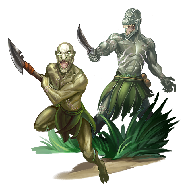 Bilokos are crocodile-snouted fey who stalk the Mwangi Jungle and feast upon the flesh of humanoids. As cunning as they are vicious, bilokos employ deadly traps and guerrilla hunting tactics to capture prey—typically hapless explorers or, occasionally, wayward villagers, many of whom believe bilokos to be cruel ancestral spirits. The most powerful of these creatures, known as elokos, wield potent transformative magic.