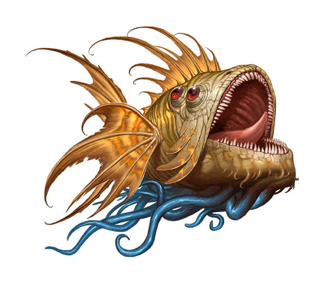 Grodairs are bizarre fishlike creature native to the First World. Their supernatural physiology includes a strange organ with an extradimensional space capable of storing thousands of gallons of water. This grants grodairs the ability to create a suitable environment for themselves anywhere by releasing the water, quickly transforming any surrounding land into a shallow bog. When grodairs wish to leave for a new location, they simply suck up all the water back up. When necessary, grodairs can also travel on land by walking upon the tangle of long, fleshy tentacles that dangle from their bellies.