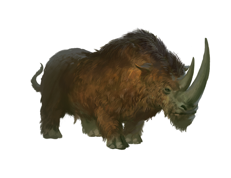 Even bulkier than their non-woolly cousins, these rhinoceroses have a shaggy pelt of long, thick fur and a huge crescent-shaped horn. Woolly rhinos inhabit areas of arid tundra and cold steppes, spending much of their day grazing for sustenance.