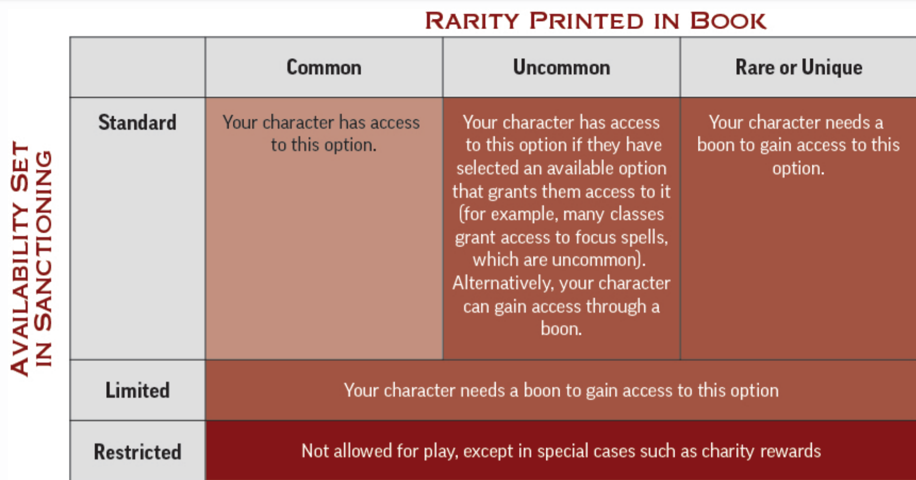 These options follow the standard rules as printed in their respective sourcebooks. If a character wants to take this option, they must meet all its prerequisites as usual. If the option is uncommon or rarer, they must also have access to the option. Characters can gain access in a variety of ways. They can gain access by virtue of their origin, religion, or their membership in certain organizations. Selecting certain common character options can give you access to other, rarer ones; for instance, a gnome who takes the Gnome Weapon Familiarity ancestry feat gains access to uncommon gnome weapons. Specific boons—such as from the Achievement Points system or Chronicle Sheets—can also grant access to these options.