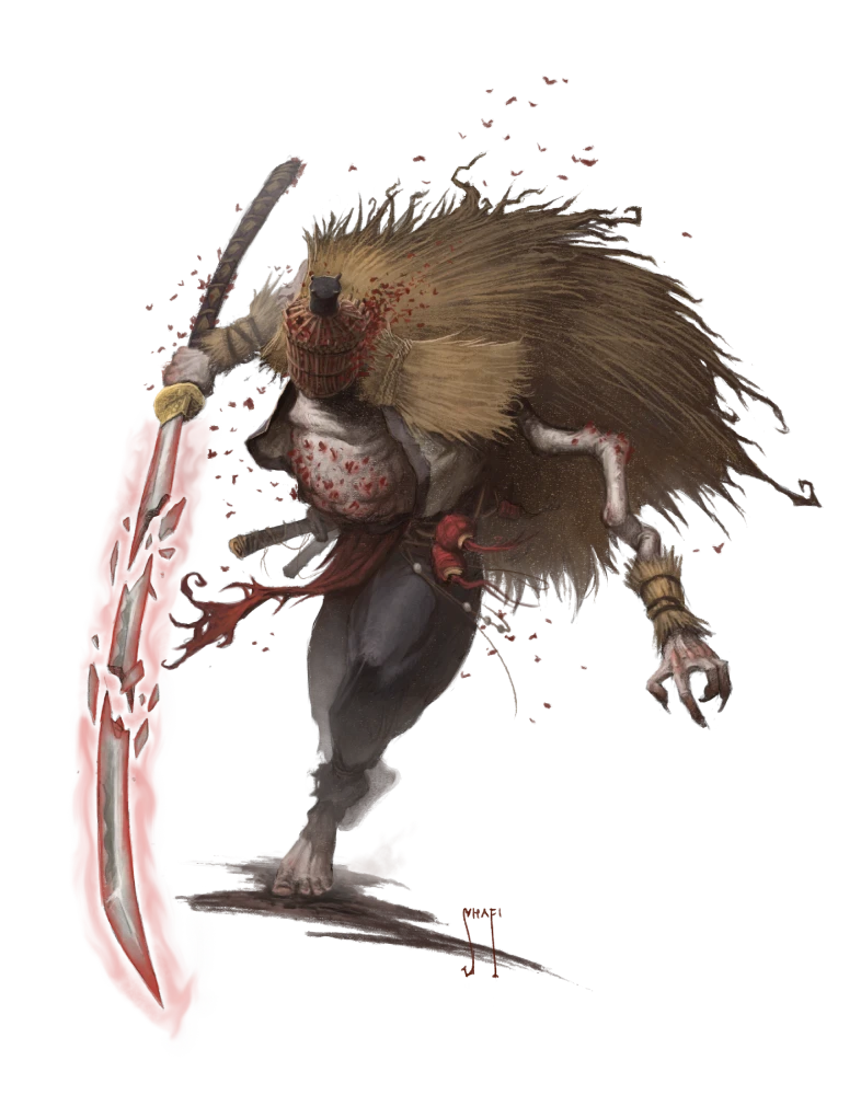 When an evil mortal soul that has been reincarnated multiple times is wrenched from the cycle of souls and corrupted, it can undergo a horrific transformation into a fiend known as a nindoru. A force for entropy and the breaking of cycles, nindorus are hideous creatures whose bodies often appear distorted, who wield weapons that have been shattered yet still function, and whose true face is often hidden from view. They display traits one might expect to see in an undead creature, such as decaying flesh or exposed bones, yet a nindoru is very much still alive.