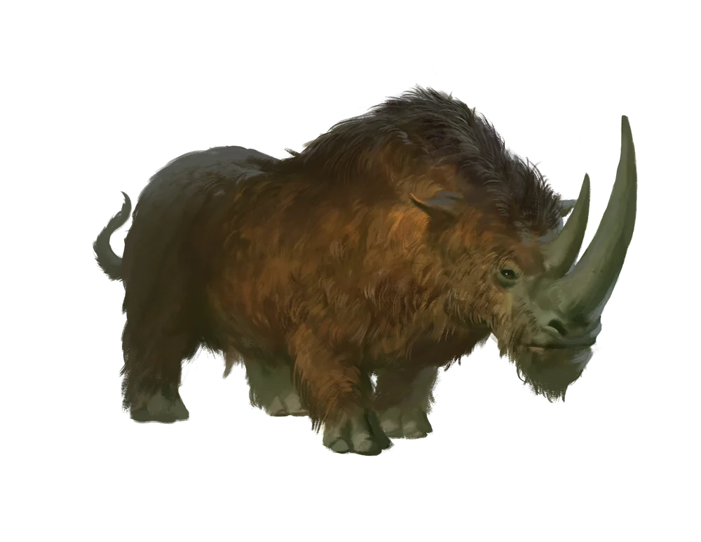 Even bulkier than their non-woolly cousins, these rhinoceroses have a shaggy pelt of long, thick fur and a huge, crescent-shaped horn. Woolly rhinos inhabit areas of arid tundra and cold steppes, spending much of their day grazing for sustenance.