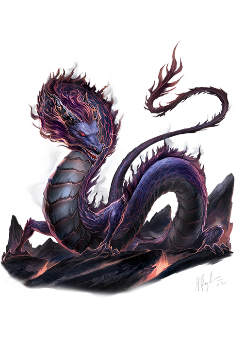 The great wyrm underworld dragon Jirukarakaza maintains a massive treasure hoard in his lair beneath the Three Fires, a trio of volcanic mountains in eastern Tian Xia. A new ruler on the Jade Throne stymied his plans to expand his empire by claiming the trade city of Hiyosai in Minkai, and now he plots his revenge.