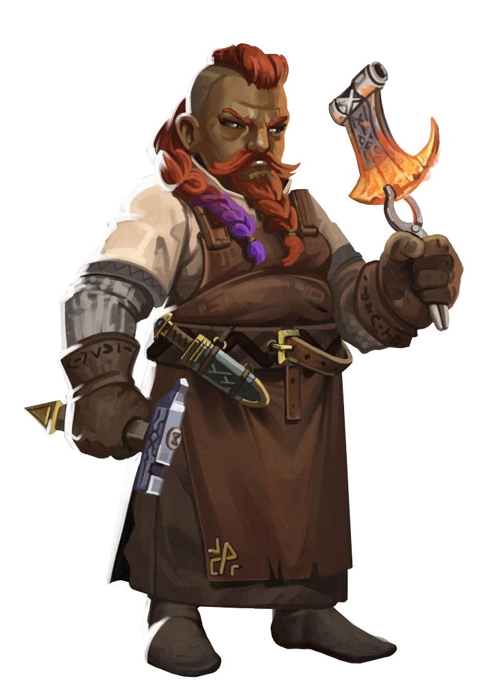 Many dwarves become smiths as their attention to detail, lifestyles that keep them close to useful materials such as iron, and a pride in their work all come together to become a brilliant skill set for working with armaments. Though dwarves are capable of smithing most any kind of item, most focus on armaments as a way of creating objects to defend their fellow dwarves.