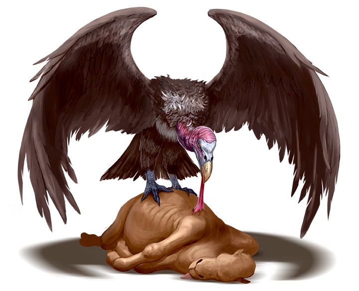 Recognizable at a distance by their black feathers and bald necks, vultures drift along air currents looking for carrion to serve as their next meal. Often grouping in committees of four or five, these scavengers wheel above battles and plague-stricken towns, eager to feed. This feeding cycle plays an important role, especially in hot regions, as their particularly potent stomach acid neutralizes dangerous bacteria in their meals and thus removes it from the environment.