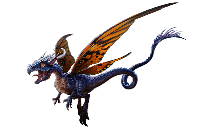 Although they are much smaller than their larger dragon cousins, faerie dragons have the many of the same physiological attributes, including long necks, toothy maws, sinuous tails, and sharp claws. They flit about on iridescent butterfly wings, the coloring of which changes based on where they live, giving them a natural camouflage. Unlike their larger kin, an adult faerie dragon remains the same size throughout its lifespan. The only visual clue to the age of a faerie dragon is the sheen on its scales, a glimmer that becomes more lustrous the older it gets.