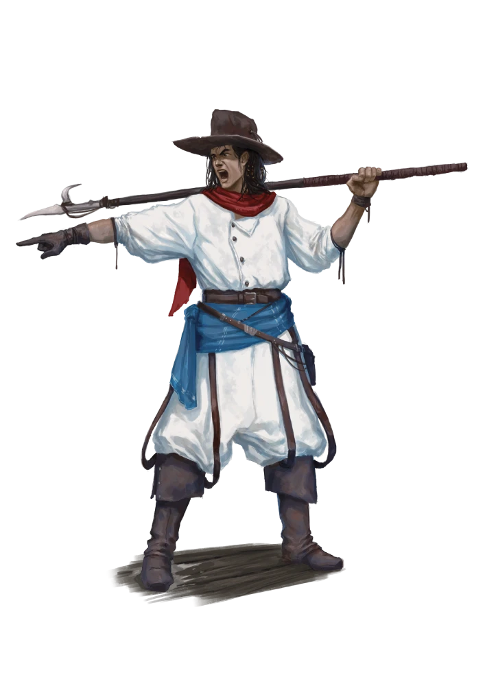 Melee [one-action] dagger +13 [+9/+5] (agile, finesse, versatile S), Damage 1d4+5 piercingMelee [one-action] fist +13 [+9/+5] (agile, finesse, nonlethal, unarmed), Damage 1d4+5 bludgeoningMelee [one-action] naval pike +11 [+6/+1], Damage 1d6+5 piercingRanged [one-action] naval pike +13 [+8/+3] (thrown 20 feet), Damage 1d6+5 piercingBosun's Command [one-action] (auditory, concentrate, emotion, linguistic, mental) Frequency once per round; Effect The bosun orders an ally to attack or to get in position. Until the end of the ally's next turn, they gain the bosun's choice of a +2 status bonus to attack rolls or a +10-foot status bonus to their Speeds.Pike and Strike [two-actions] The bosun makes a melee Strike with their naval pike. If this Strike hits, the bosun can either move the target 5 feet within the pike's reach or make a fist Strike against the target without increasing their multiple attack penalty until after the fist Strike.