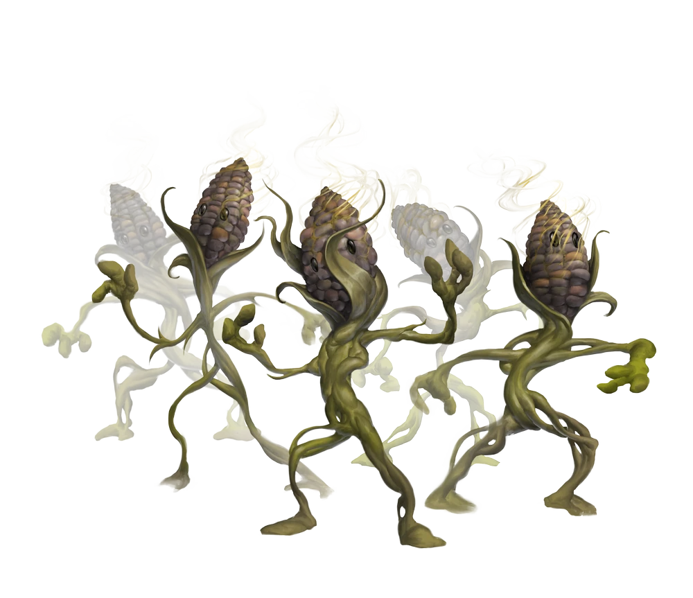 A thick forest or flourishing farm sometimes sees an explosion of primal magic leading to the creation of a multitude of leshies. When still young, these spirits might band together with their crop-mates for protection or to achieve a mutual goal. Used to growing in rows, many corn leshies can form a sizable legion.
