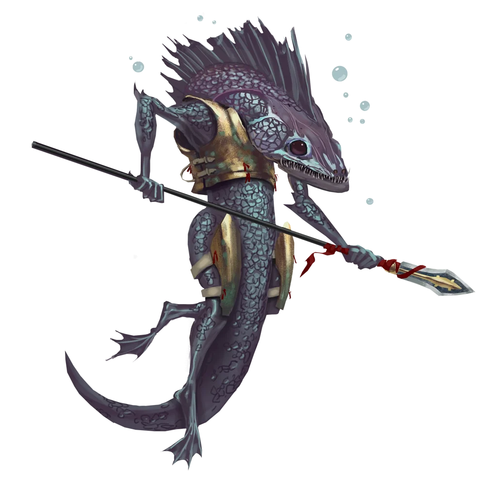 Sedacthies are amphibious, fish-like humanoids who lurk in Golarion's oceans and are known for leading their animal servants ashore to devour air breathers. When an entire fishing village disappears overnight, sedacthies are the first suspects. Sedacthies pride themselves as natural leaders, with ambition limited only by their strict adherence to hierarchy. A sedacthy's station is determined by the strength of the animal servants they press into service, and the mettle they prove during hunts and in battles against outsiders.