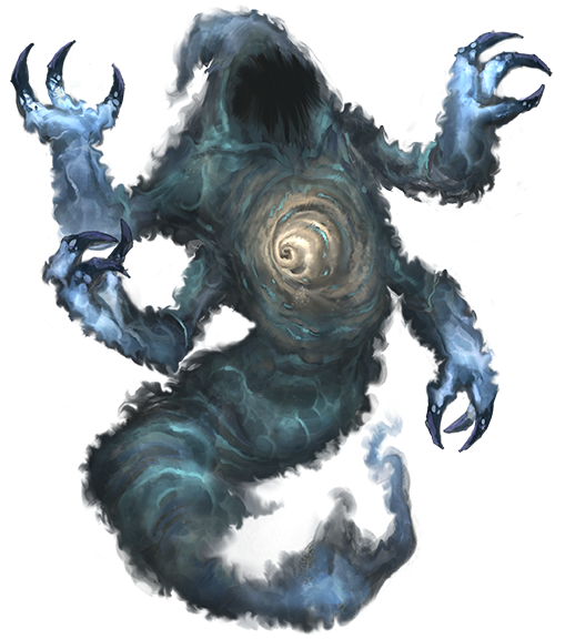 The bythos is a guardian of space and time, and at all times seeks out those who misuse planar and temporal magic. A bythos is a roughly humanoid creature with four arms and a body made of swirling clouds and mist. Despite its appearance, its body feels like dry stone. A bythos seeks out paradoxes caused by irresponsible planar or dimensional travelers and repairs breaches where the barriers between planes have become thin or damaged. If the mortals responsible remain in the area and cannot be convinced to cease their activities, the bythos has no qualms about removing them. Using its ability to manipulate time, a bythos might cause an opponent to quickly die of old age as time speeds up around them, or cause a target to disappear from time and space.