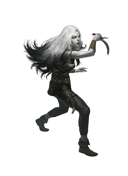 The people known today as fetchlings are a distinct ancestry descended from generations of humans who became trapped ages ago on the Shadow Plane. No longer human at all, these people, who call themselves kayals, have become monochromatic in coloration, with flesh tones and hair colors varying between white, black, and all shades of gray. Their limbs are lithe and willowy, and their eyes are generally solid yellow, yellow-green, or white, though a rare few have a purple or blue glow.
