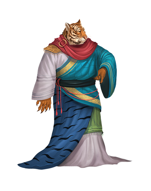 Raja's heads often resemble those of cats or snakes, but they can also be similar to apes, jackals, vultures, elephants, mantises, lizards, rhinos, boars, and more are possible. In most cases, the type of head a raja rakshasa possesses symbolizes its personality—a tiger-headed one is stealthy and ravenous, while a boar-headed one might be gluttonous and crude.