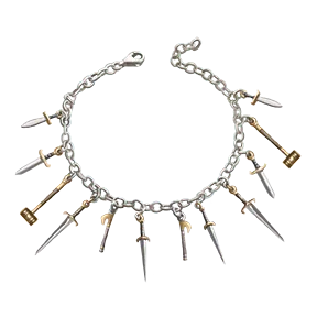 Several small charms shaped like weapons hang from an armory bracelet, which is often brass. The bracelet has one charm each for the groups bow, brawling, club, dart, flail, hammer, knife, pick, polearm, shield, sling, spear, and sword. Rare versions of the armory bracelet include charms for firearms.