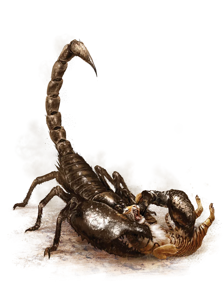 Chitinous scourges of deserts, forests, savannas, and badlands, scorpions are deadly arachnids with powerful pincers and a painful sting. Scorpions can be found in nearly every climate, where they hunt their prey with a mixture of patient stealth and raw strength. Most scorpions live in underground burrows, either as lone hunters or part of a larger colony. These arachnids are so feared and dangerous that in many cultures, they are treated as deities or dualistic symbols of both death and protection from said death.