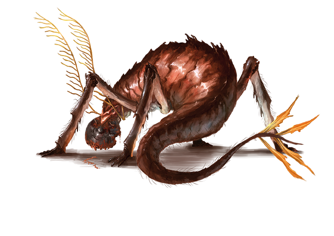 Found in lost dungeons, deep caves, and abandoned mines, rust monsters are a bane to any adventurers who rely on armor, weapons, or other metal items. These strange-looking creatures grow to about 5 feet long, with four insectile legs and a long tail ending in a four-pronged appendage resembling a tiny windmill. However, it is the rust monster’s feathery antennae that strike fear in the hearts of battle-hardened warriors, for a single touch from even just one antenna can reduce an adventurer’s most valuable tools to a useless pile of rust.