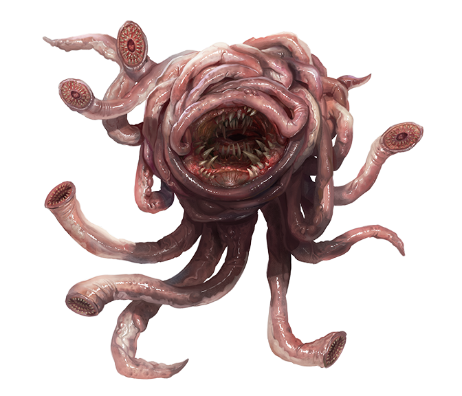 Little more than a coiled mass of intestines encircling a massive gaping maw, this qlippoth is an Abyssal scavenger, subsisting on the filth and leftovers of demons and qlippoth alike, although it relishes any opportunity to consume living prey. Despite this seeming lowly role in the Abyssal ecosystem, a nyogoth is far from a stupid beast and can orchestrate cunning ambushes to secure its next meal.