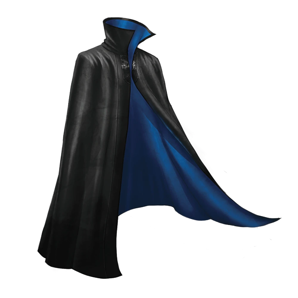 This black velvet cloak has a silvery blue iridescent lining. The cloak can be worn with either side facing out—switching from one side to the other requires two Interact actions. If these actions are both taken on the same turn, the act of removing and redonning the cloak doesn’t cause it to lose its