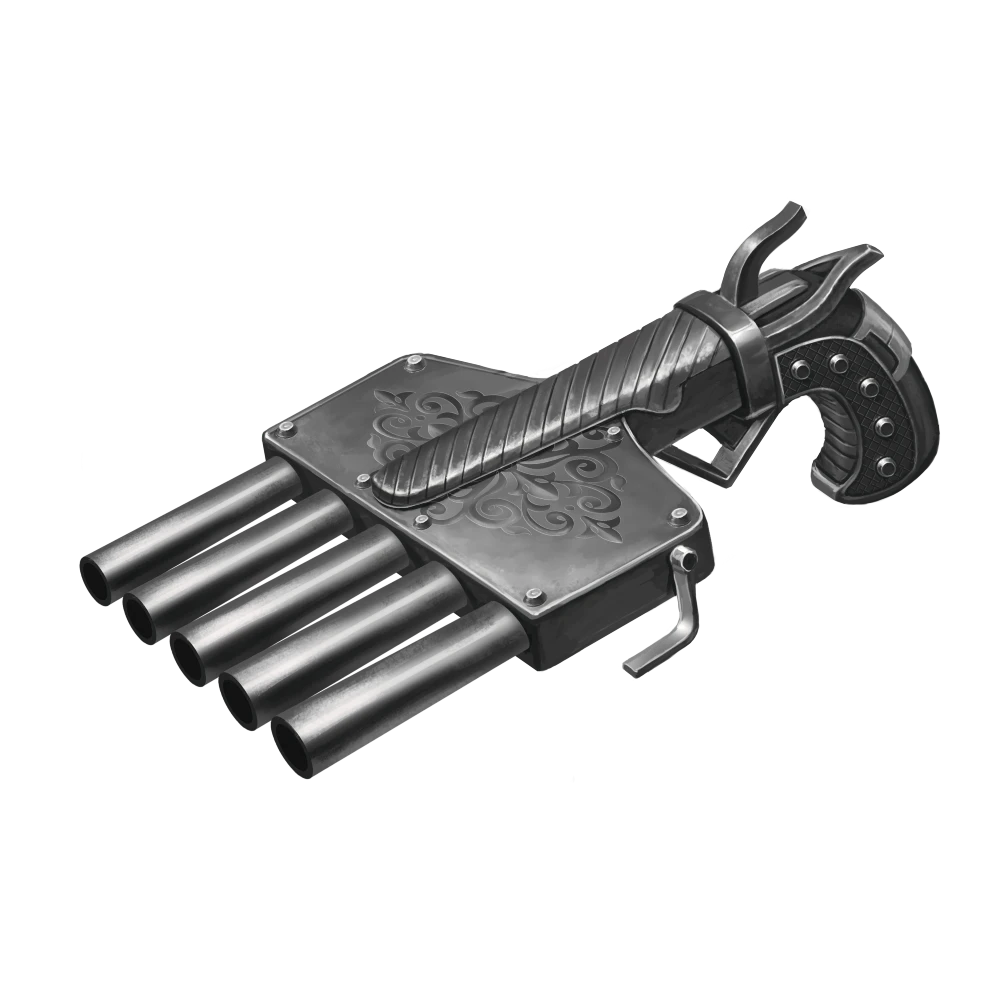 Also known as a harmonica gun, this weapon is essentially a stock, trigger, and firing mechanism attached to a sliding brace of barrels that can each hold a round of ammunition.