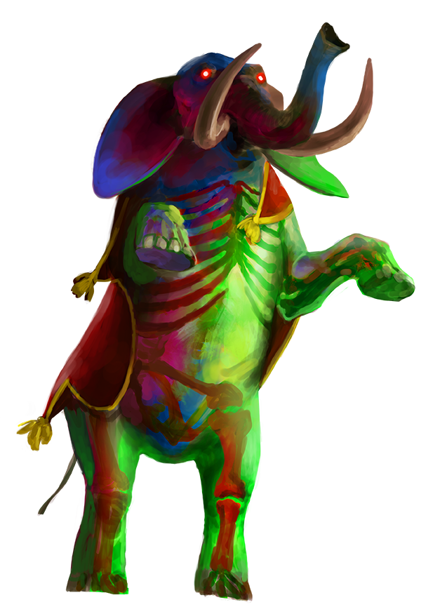 Melee [one-action] tusk +14 [+9/+4] (reach 10 feet), Damage 3d8+7 piercingMelee [one-action] trunk +16 [+11/+6] (reach 15 feet), Effect grabbing trunkMelee [one-action] foot +14 [+9/+4] (reach 10 feet), Damage 2d10+7 bludgeoning plus color splashColor Splash (visual) When the iridescent elephant stomps its foot, a bright, disorienting burst of light pulses through its leg. Each creatures adjacent to the iridescent elephant when it makes a foot Strike (regardless of whether or not it hit) must succeed at a DC 24 Will save or be flat-footed until the beginning of the elephant’s next turn.Grabbing Trunk A Medium or smaller creature hit by the elephant’s trunk is grabbed. If the elephant moves, it can bring the grabbed creature along with it.Trample [three-actions] Large or smaller, foot, DC 22Trunk Beam (visual, light) Frequency once per day; Effect The iridescent elephant blasts a beam of light from its trunk in a 30-foot line. Each creature in the area must attempt a DC 22 Fortitude save.