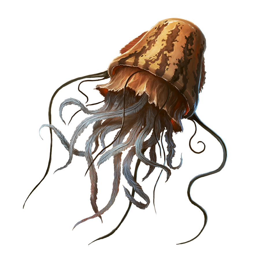 A large number of types of monstrous jellyfish dwell in the worldfs oceans, each with their own unusual specialty in hunting. The immense vampire jellyfish is a blood-drinking monster that often attacks sailors aboard ships. Among the largest are the dreaded whaler jellyfish, colossal creatures that feed on whales or even krakens.
