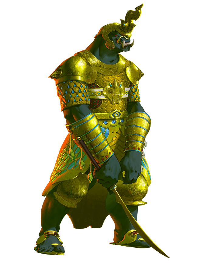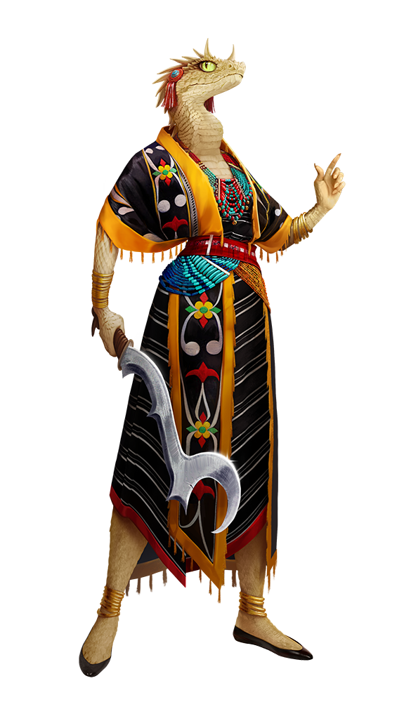 Nagaji originated in the Tian Xia region of Nagajor. Though they have since spread across Golarion to regions such as Vudra and Jalmeray, many of them still carry traditions from their ancestral homeland. Tian and Vudrani concepts of elements, medicine, and spirituality are highly common among nagaji, especially given their tendency of seeing themselves as highly pious beings. Nagaji mostly eschew the human concept of castes, beyond the vague view of a “natural order” that sees nagas as holy guides to mortal nagaji, but they can see the appeal of the concept of karma and the righteousness of fulfilling their proper role in the universe. While they have little physical need for clothes, as they stick to hot and humid environments, nagaji wear them with pride and treat them as decorative elements in the same manner as jewelry.
