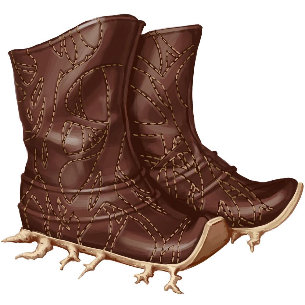 The soles of these plain leather boots look like coils of flattened roots. The boots allow for full-foot flexibility despite their sturdy make and smell faintly of evergreen trees. While worn and invested, your footsteps sound like rustling leaves, granting you a +1 item bonus to Stealth checks in a forest or wooded area.
