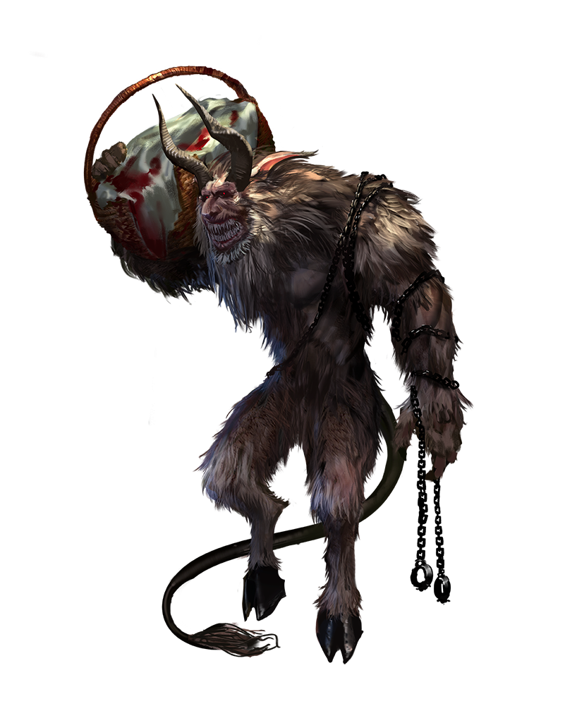 Krampus's origin is unknown; residents of the small towns and villages he terrorizes in northern Irrisen believe the creature has always existed, coming forth once a year to punish those he deems wicked. While many legends have been told about Krampus's beginning, the most popular of them starts with a handful of mountain towns under the protection of a circle of druids. After a series of harsh winters that the townsfolk barely survived, they began to doubt the power of the druids and their rituals. As the villagers grew more resentful, the druid circle took drastic action. Under the light of a blue moon, the druids opened an imperfect portal to the primal realm of the fey and called forth the most powerful spiritual essence they could, and a new creature was born—Krampus. However, unknown to the druids, the portal had been corrupted by the villagers' bitter resentment and doubt. Instead of a central figure to lead them in winter celebrations, as they had hoped, the druids had spawned a monster who sought to punish those who had behaved selfishly during lean times.