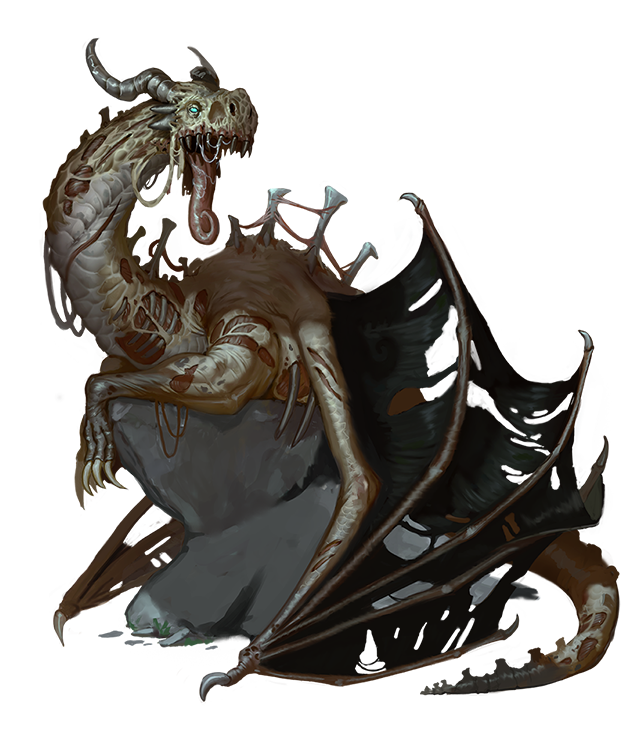 The rotted husk of a once great dragon, this abomination has lost all its former splendor, but none of the ferocity. Its patchy, rotted wings don't generate enough lift to keep it aloft, but the foul necromantic energies animating it still allow it to fly, albeit slowly.
