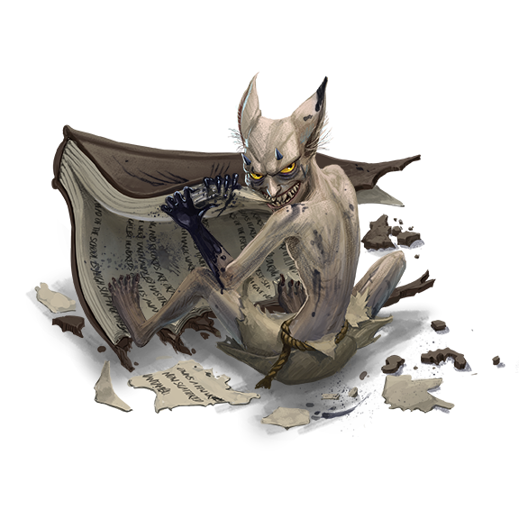 Scrits are short, spindly gremlins with gray or beige leathery skin and a coat of smeared ink on their fingers. They make themselves the nightmare of many scribes and librarians, as they delight in nothing more than destroying books, scrolls, artwork, and other records or writing. The oils on a scrit's skin smears ink and renders text—even magical writing— completely illegible. Once they have smeared every page of a book, scrits devour them whole, absorbing the contents the book used to hold. After eating books they find stupid or funny, scrits hold skits for other gremlins which mock the mortal authors for the amusement of the other fey.