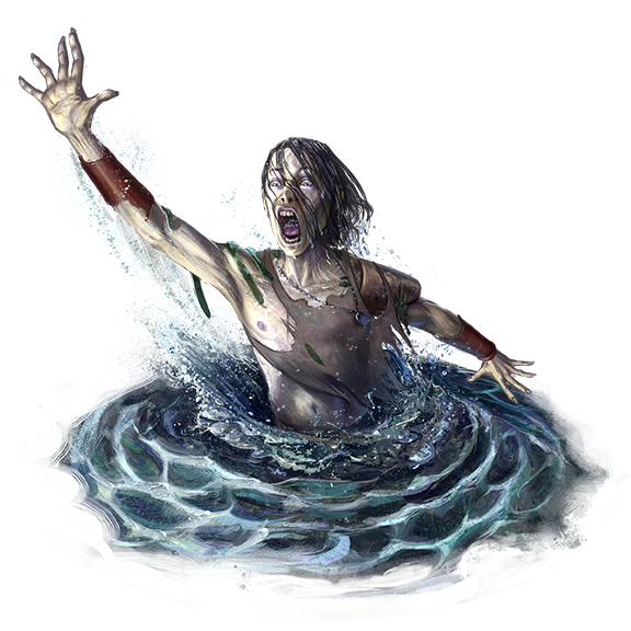 When great heroes or other powerful individuals encounter misfortune and die at sea or to other water-related accidents, the anguished soul sometimes clings to its corpse, creating a drenchdead. Drenchdead prefer to lurk in water and attack from ambush, giving victims the same deadly surprise that led to their own deaths. A drenchdead can manipulate water to drown a victim directly but prefers to draw out this suffering.