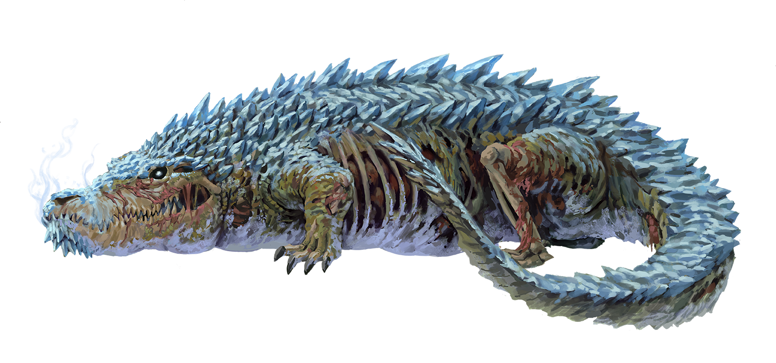 Whatever Ulgrem-Axaan looked like in life, undeath has revealed a rotting, crocodilian skeleton encased in a jagged hide of ice crystals. Steam rises from the creature's mouth and back as its icy skin melts in the sun or from the heat of the electricity it cycles through its body.