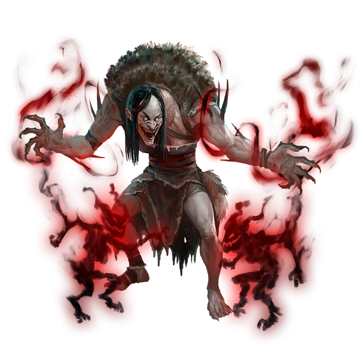 In a land where the undead rule and corpses openly walk the streets, an annis hag attracted relatively little attention. Dragging her wounded leg—the scars left by the Magaambyans would never fully heal—Taviah took shelter in Axan Wood and built a cottage. The site of her new home was no accident; she constructed it where she saw the boundary with the Shadow Plane was especially thin. She swiftly dominated the local wildlife and those who dared to share this corner of the gloomy forest with her. When Nathnelma went looking for hags to form a coven called the Graveclaw, Iron Taviah's reputation spoke for itself. Taviah accepted Nathnelma's offer on the condition that their coven should remain scattered. Taviah had grown comfortable in the Axan Wood and didn't trust a new home Nathnelma or her other “sisters” might provide her.