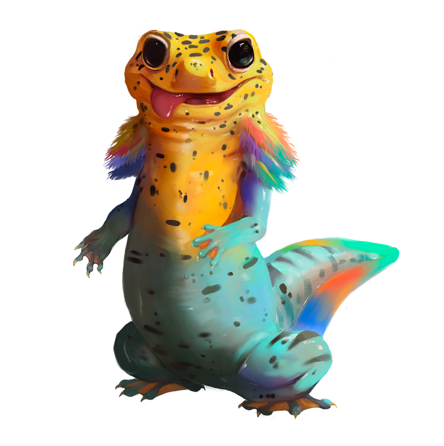 Native to the coastal provinces of eastern Holomog, these strange amphibians have frilled, iridescent gills that appear asymmetrically on either side of their bodies. Random arrays of spots, stripes, and other patterns decorate their flanks, and it's said no two shimmernewts have the same coloration. Originally, shimmernewts were ordinary (if oversized) amphibians, living their lives between brackish coastal lakes or tidal pools and the steamy jungles nearby. Over time, the ambient chaotic energies flowing through Holomog magically altered their evolution. The shimmernewts of today barely resemble their ancestors.