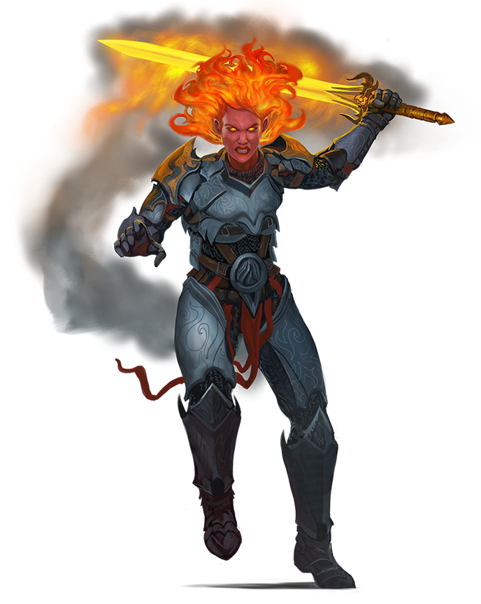The most militaristic of all giants, fire giants focus obsessively on learning combat techniques, mastering the arts of forging weapons and armor, and finding new ways to dominate their enemies. As a result, their social and political structures are grounded firmly in martial hierarchies, with a strict emphasis on following the orders of one’s superior, no matter if you are accountable to a lowly soldier or report to a powerful officer. As soon as a fire giant can walk, they are fitted with their first suit of forged armor. This armor is constantly remolded and replaced as the fire giant matures, both to ensure they are comfortable with steel against their skin and also to teach the giant as early as possible that they bear the burden of fighting to protect their traditions and way of life. To a fire giant, death is the flame in which the future is forged.