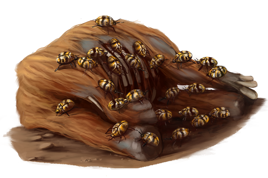 When a massive creature such a dinosaur or giant dies in skin beetle territory, the industrious vermin swarm together.
