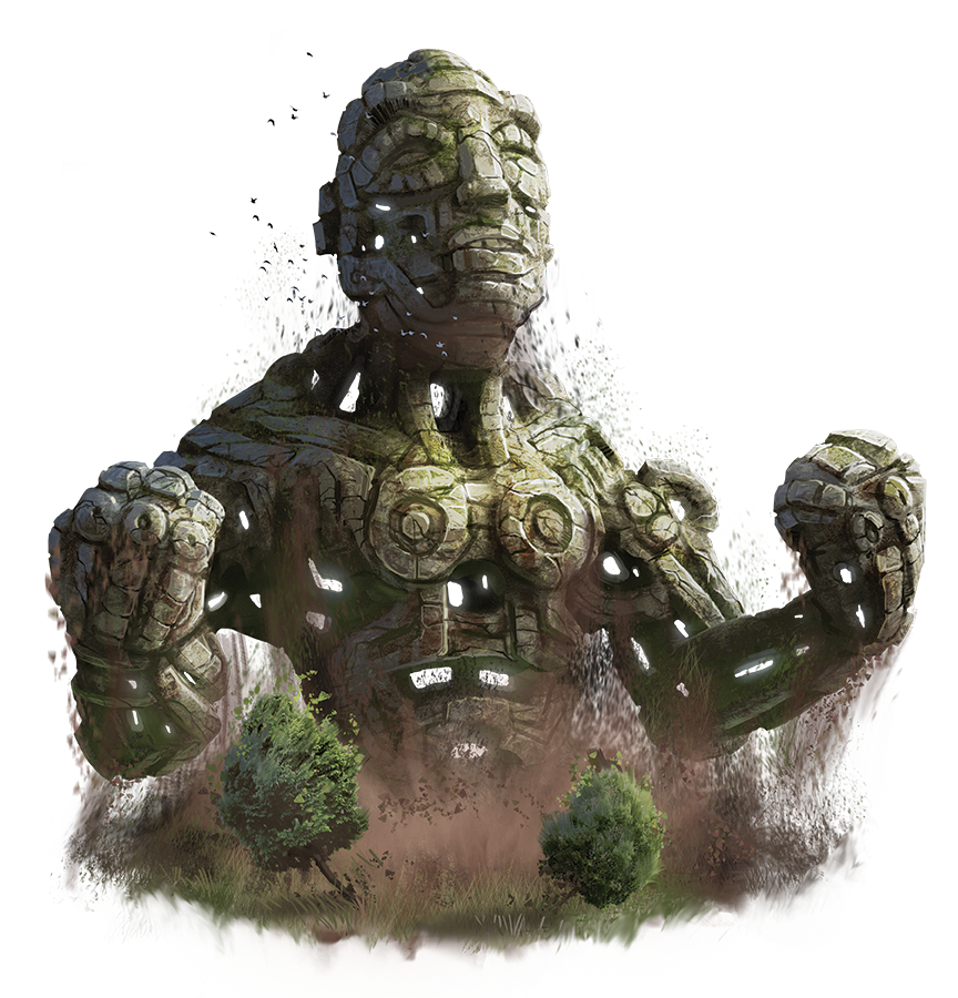 A guthallath is an enormous construct created long ago by some unknown empire, probably as a war machine. Nearly 100 feet tall, this massive stone statue typically resembles a stalwart warrior wearing only a loincloth and skullcap. Few have seen the entire body of a guthallath, though; most of the time such a relic is buried up to its neck, covered in moss and stranded in some forgotten place. Yet, every so often, one of these harbingers of destruction reactivates in response to some unknown stimulus or rallying call, and when this happens, woe be unto any who stand in its way.