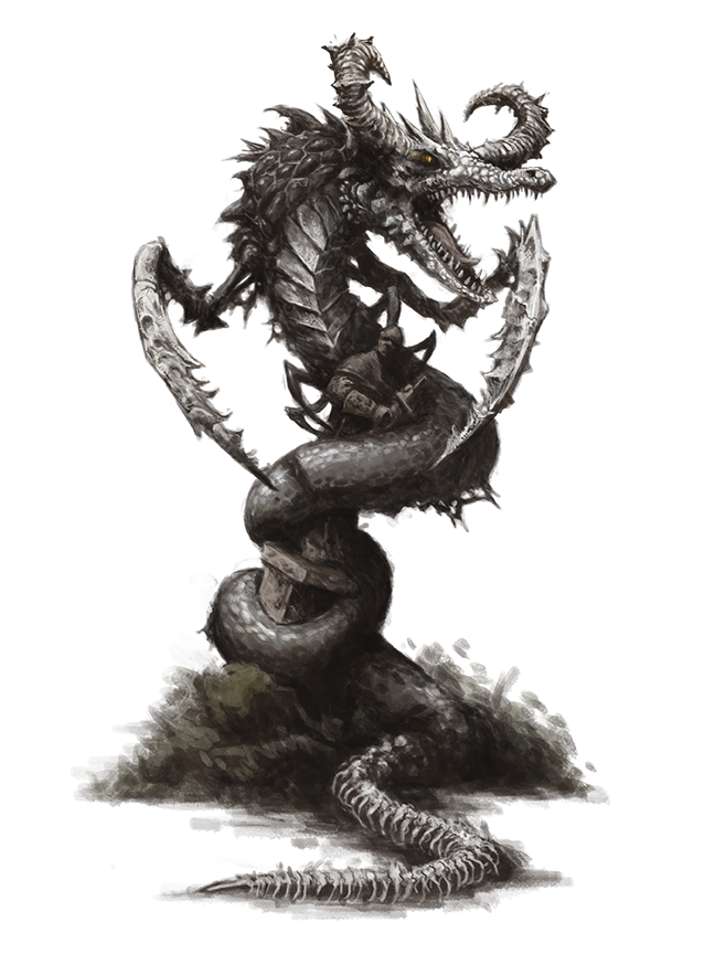 Known also as terror daemons, the horrifying phasmadaemons make use of illusions and their own frightening appearance (that of a serpent with a bony tail, a horned crocodilian skull for a head, and several insectile pincers) to strike fear into the hearts of others. They represent deaths brought about by fright.