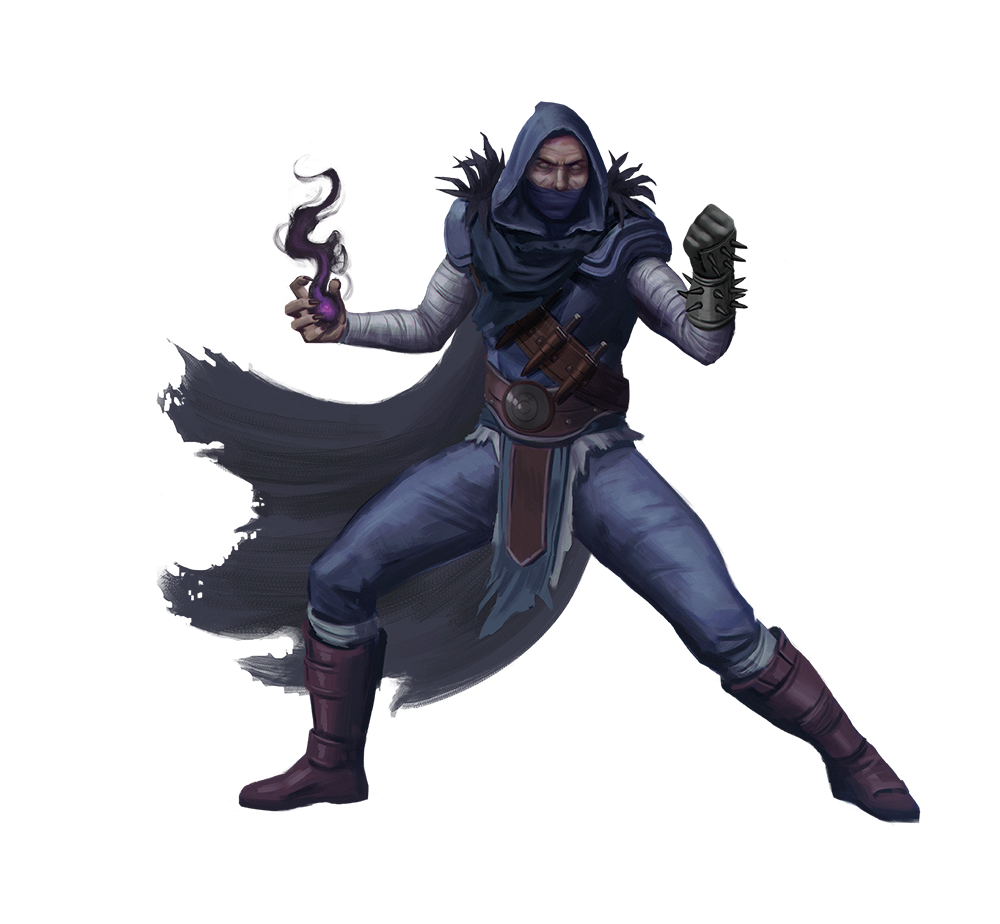 Caligni assassins gain their power from an infusion of planar essence directly from the Netherworld, which the owb help them develop into powerful abilities. This comes at a cost: all caligni assassins eventually succumb to an affliction known as shadowfade. This magical malady causes the caligni's body to painfully warp when concealed in shadows, as the plane's ability to create twisted reflections of reality changes their physical form directly.