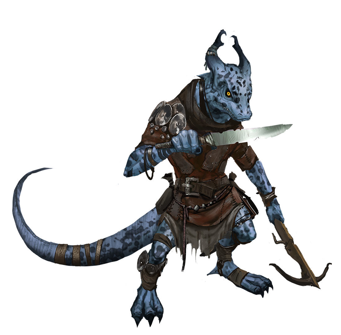 Kobolds are small, reptilian humanoids who carry physical similarities to true dragons. They lurk in dark spaces, usually tunnels and mines beneath the earth, in either warrens of their own design or complexes discovered and colonized after the original builders have moved on. Though kobolds are far more pragmatic than they are courageous, they use every inch of their cunning to even the playing field between themselves and other, stronger creatures. They attack from the darkness and at range, and kobold artificers and engineers master the art of simple but effective traps, which they use to protect their lairs. Kobolds are skilled at working together by necessity, and they often set up ambushes or hit-and-run assaults that allow them to do the most damage possible without being harmed in return.