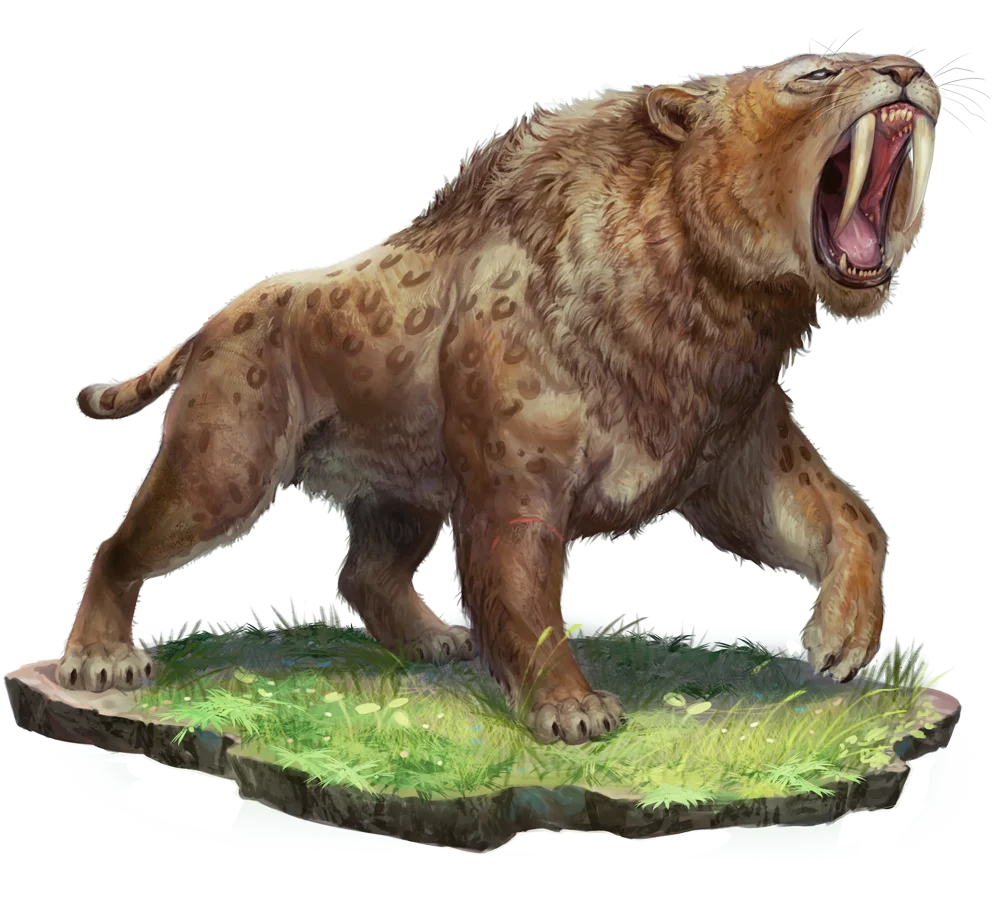 Smilodons are large saber-toothed cats, apex predators that are significantly more muscular and broader than the other species of big cats. They often kill prey with a quick stab to the throat or other vulnerable spot. The smilodon's oversized fangs are particularly sought after as trophies.