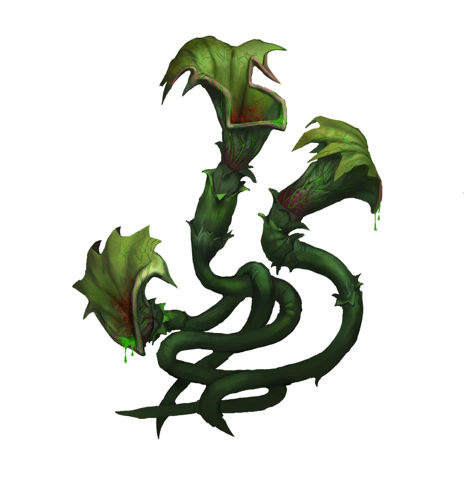 Many varieties of dezullon exist, including lumbering giants of incredible size, dezullons with tiny, cup-shaped pitchers that proliferate along lengths of creeping ivy like suckers on a squid's tentacles, and a variant with hundreds of blood-red, razor-sharp leaves that protrude from the inside of their pitchers like a leech's teeth. This latter variety is especially dangerous, since the leaves can all but eviscerate creatures that become trapped inside their pitchers.
