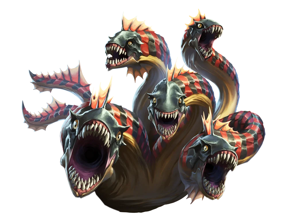 Hydras are multiheaded, foul-tempered serpentine beasts with voracious appetites, widely feared for their regeneration abilities.