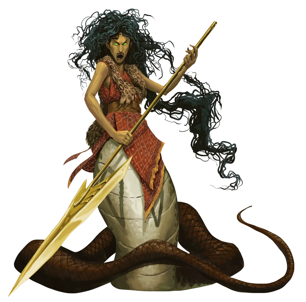 Lamias are bloodthirsty victims of an ancient curse for which they blame the gods. Most lamias are humanoid from the waist up but have the lower bodies of serpents. Sinister magic comes naturally to a lamia, and they prefer the use of illusions to deceive prey for later consumption, or simply to torture.