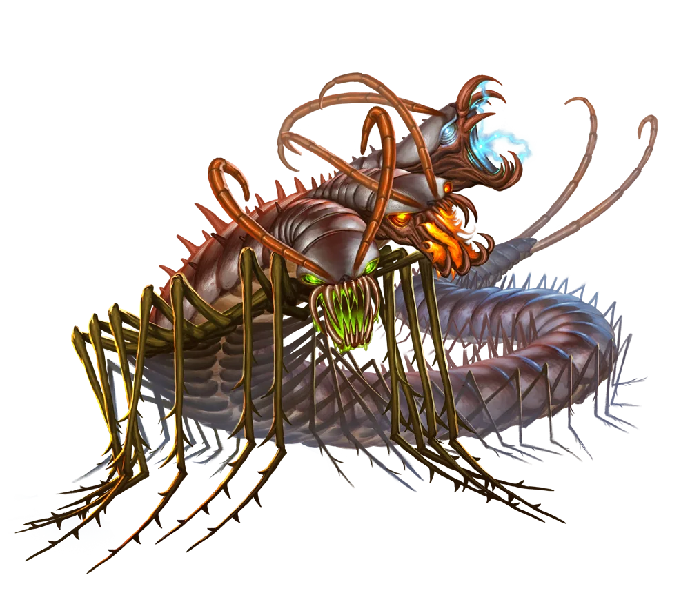 Fearsome centipede-like creatures, mukradis are three-headed predators with a devastating array of ways to kill, burn, and dismember. A version of the mukradi that dwells in the Darklands is rumored to exist. It's said these variant mukradis have black scales, and all of their heads spew a black, acidic goo that animates before being reabsorbed by the mukradis.