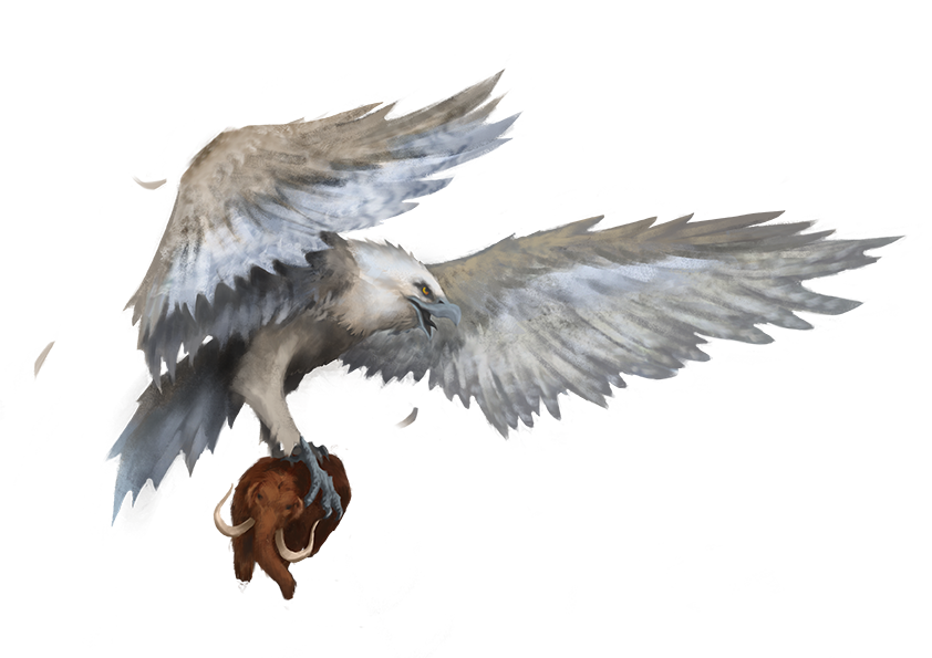 Legendarily massive raptors capable of carrying off elephants as prey, rocs are typically about 30 feet long from beak to tail and have a wingspan of 80 feet or more. While their beaks are hooked to rip flesh from bone, their hunting strategy involves grabbing their prey in their powerful talons and then dropping it from great heights before feeding. This method creates a massive amount of carrion, which guarantees that rocs are followed by flocks of opportunistic scavengers, such as ravens and buzzards, who find it easy to steal bits of the larger birds’ meals. Rocs, for the most part, don’t mind these creatures, which sometimes get gobbled up along with the rest of the roc’s food.
