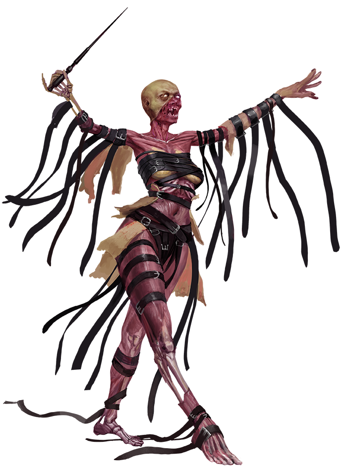 Velstracs are horrific, shadow-dwelling fiends who seek ultimate sensation through self-mutilation. They transcend their stoic detachment only when inflicting pain and terror upon their victims, practicing new forms of debasement and torture before then turning their knives on themselves. Although velstracs consider themselves beyond such limitations as morality or mortal taboos, their victims know them as emotionless tormentors who inflict debased, sadistic suffering. They claim to seek perfection in thought, form, and action, although they don’t recognize any refinement that doesn’t require the painful excision of the flesh or spirit.
