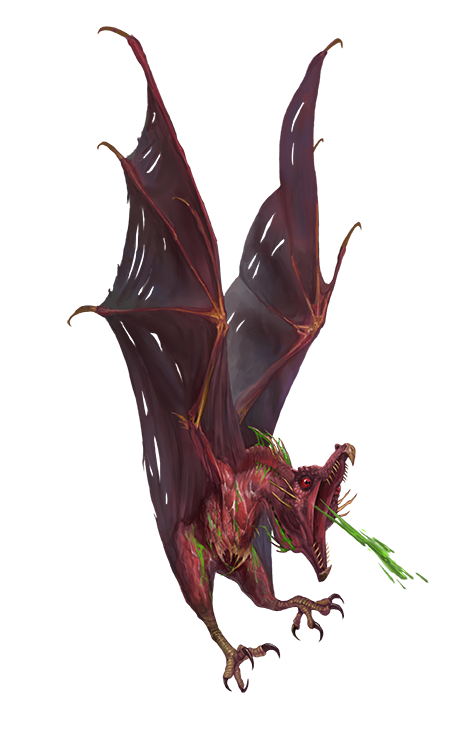 Qurashith—or “gluttonwings” in the Common tongue—are fearsome, bat-like predators that haunt the upper reaches of Gluttondark’s cavern-worlds. These monstrosities are no mere beasts. A qurashith does not simply devour its victims; once it kills its prey, it physically subsumes the creature into its own body, metabolizing the prey’s spiritual essence. Close inspection of a qurashith reveals that its body is an amalgamation of the fiend and its extraplanar and mortal victims, bound together by webs of demonic scar tissue and sticky acidic pus. While the individual personalities of a qurashith’s victims gradually metabolize and diffuse into its very substance over time, a particularly charismatic or magically powerful victim might exert some influence over the qurashith’s mind for a short time.