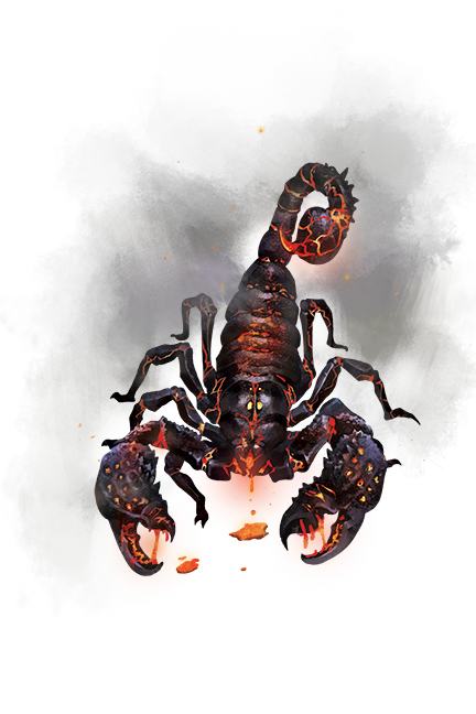 Whether skittering through Abyssal wastelands or basking in the searing sand of the deepest deserts, magma scorpions have charred carapaces constantly emitting vision-warping waves of heat.