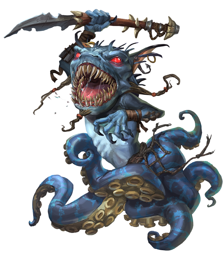 The top half of a grindylow looks vaguely like that of a goblin, but from the waist down, their bodies split into a tangle of suckered, wriggling tentacles. They dwell mostly in shallow waters both fresh and briny, including lakes, rivers, coastal regions, and near coral reefs. Grindylows generally organize into schools ranging from a few individuals to a few hundred. Smaller schools can sometimes be brought under the leadership of a powerful aquatic creature, though such alliances last only until the school faces a major setback, at which point the surviving grindylows scatter and form smaller schools of their own.