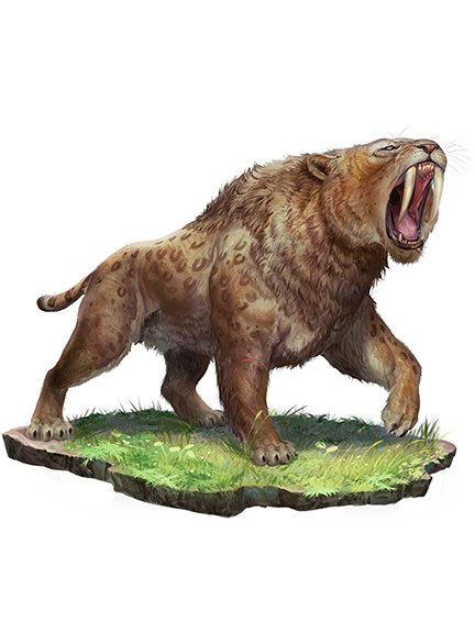 Smilodons are large saber-toothed cats, apex predators that are significantly more muscular and broader than the other species of big cats. They often kill prey with a quick stab to the throat or other vulnerable spot. The smilodon’s oversized fangs are particularly sought after as trophies.